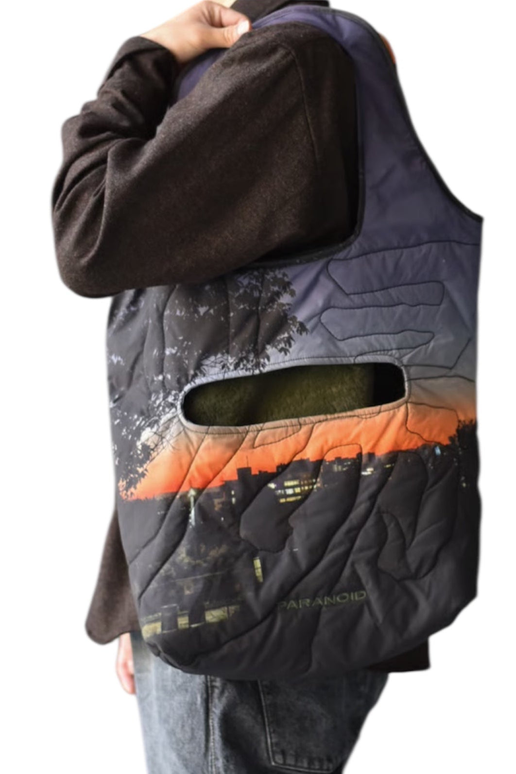 ポリエステル生地にプリントを施したキルティングトートバッグ。
